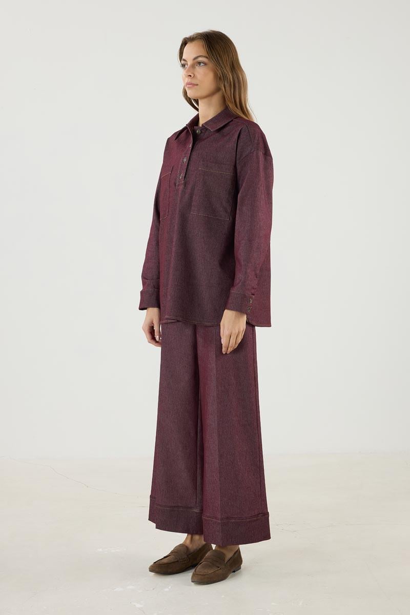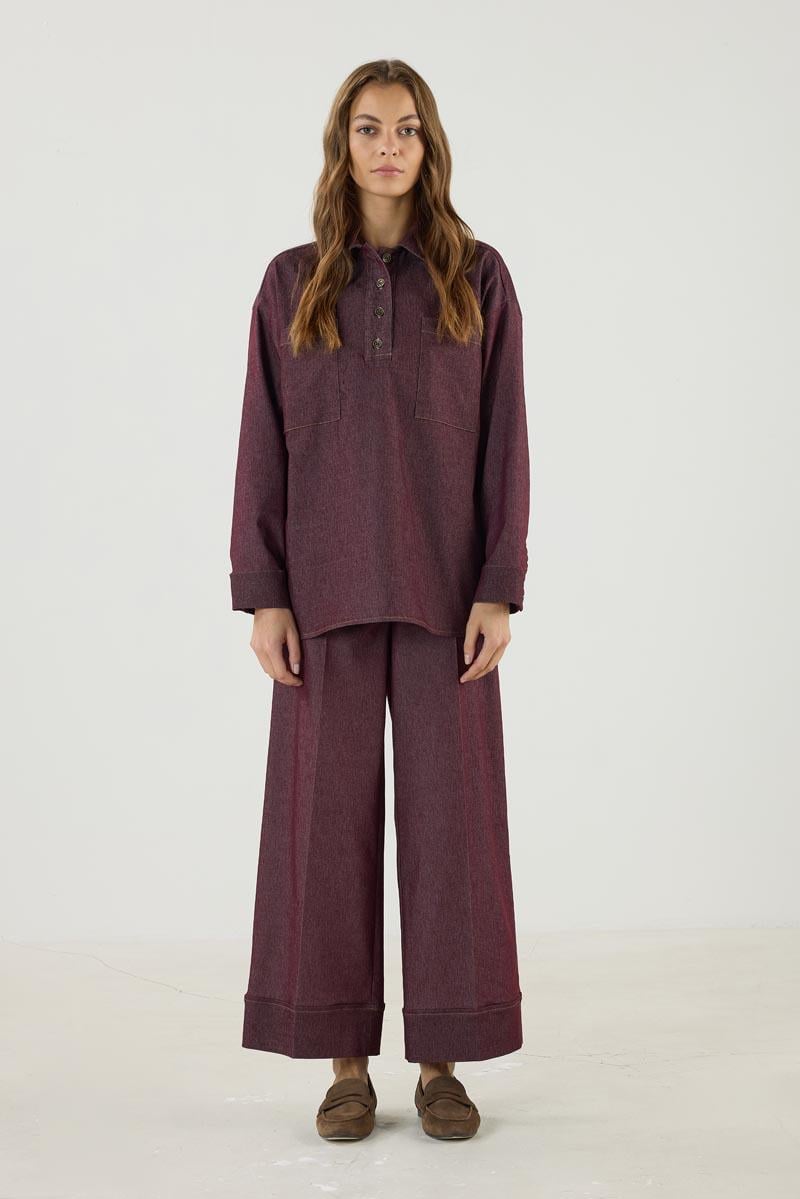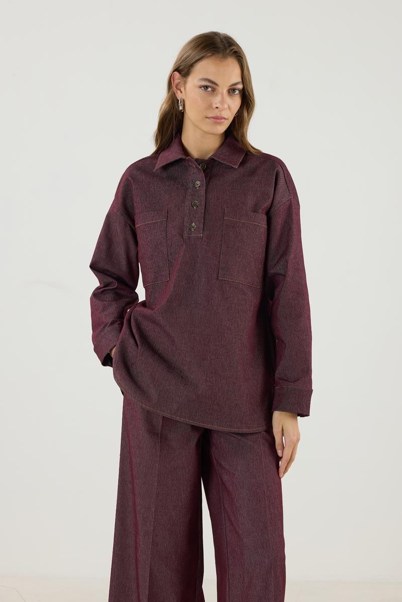 Kadın Gömlek Yaka Uzun Kollu Cepli Kot Gömlek Bordo (MTB25KGMK002)