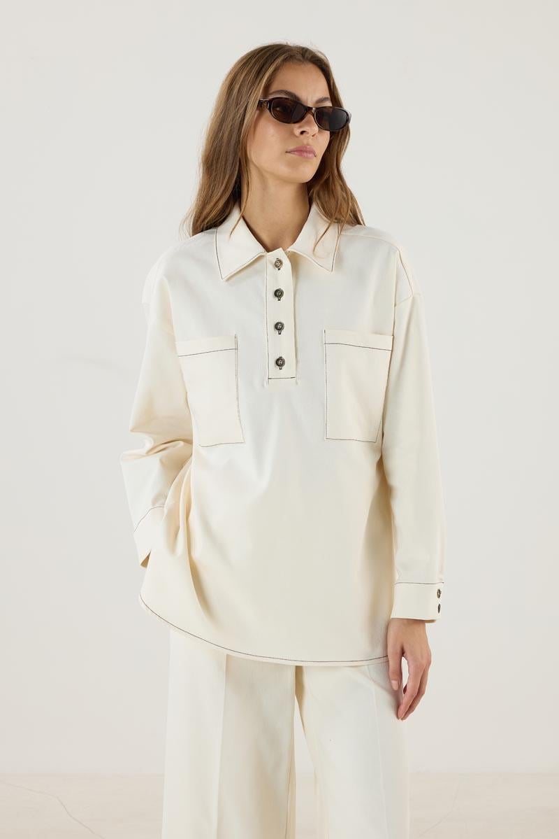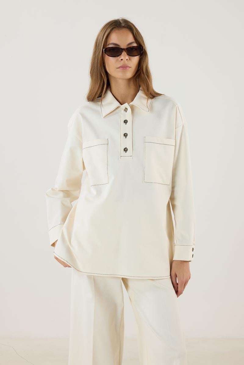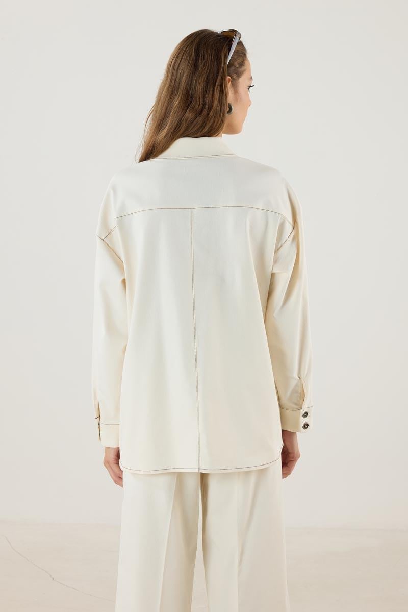 Kadın Gömlek Yaka Uzun Kollu Cepli Kot Gömlek Ekru (MTB25KGMK002)