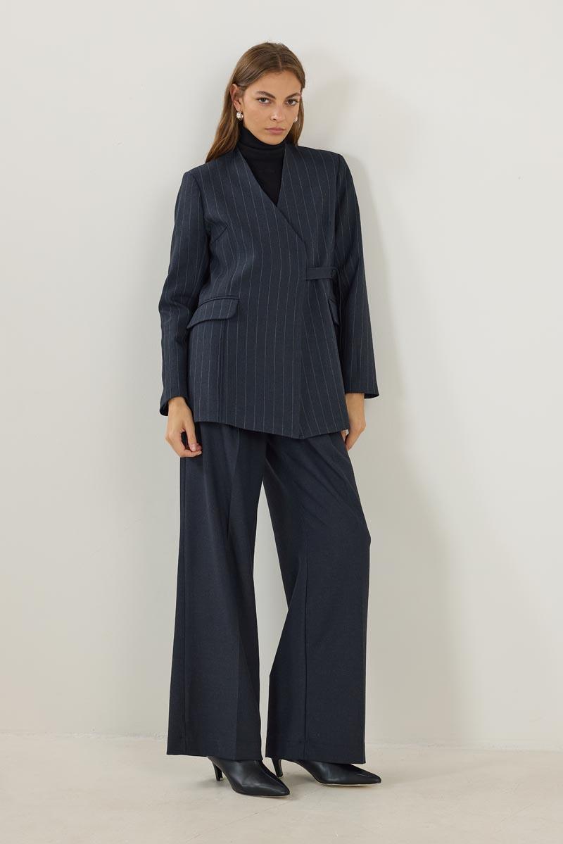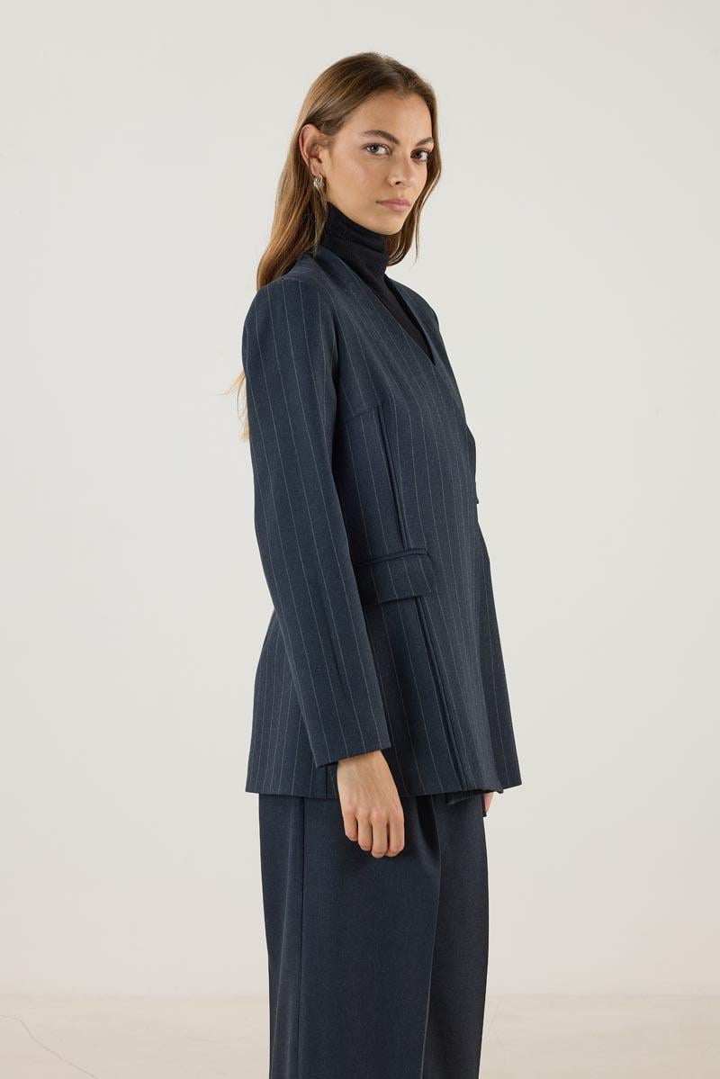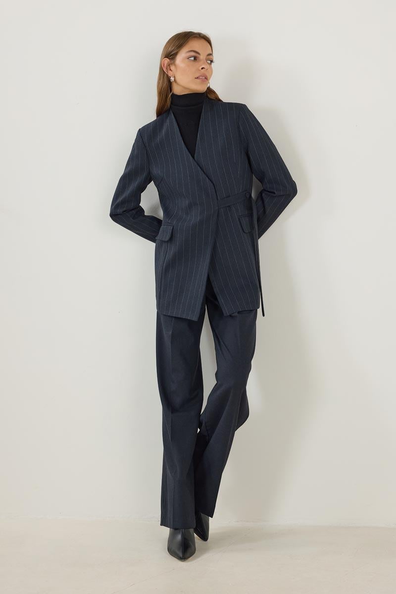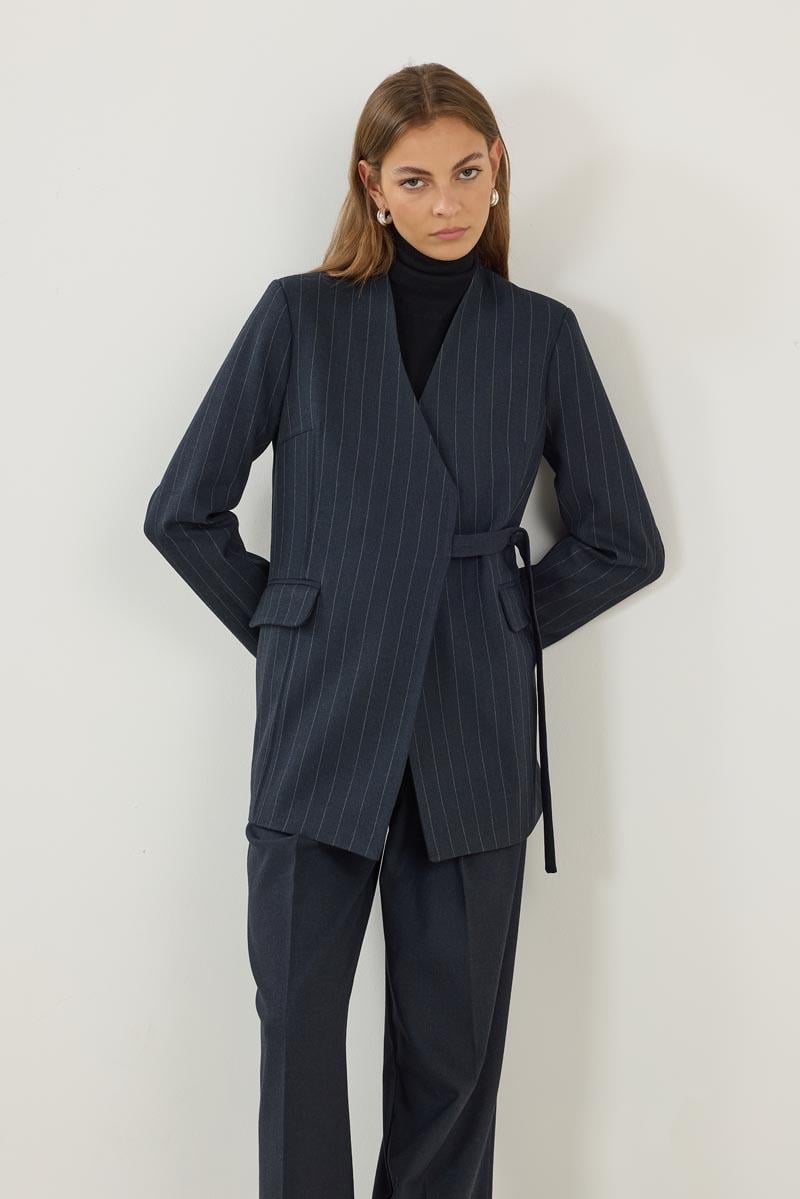 Kadın V Yaka Düğme Detaylı Çizgili Blazer Lacivert (MTB25KCKT001)