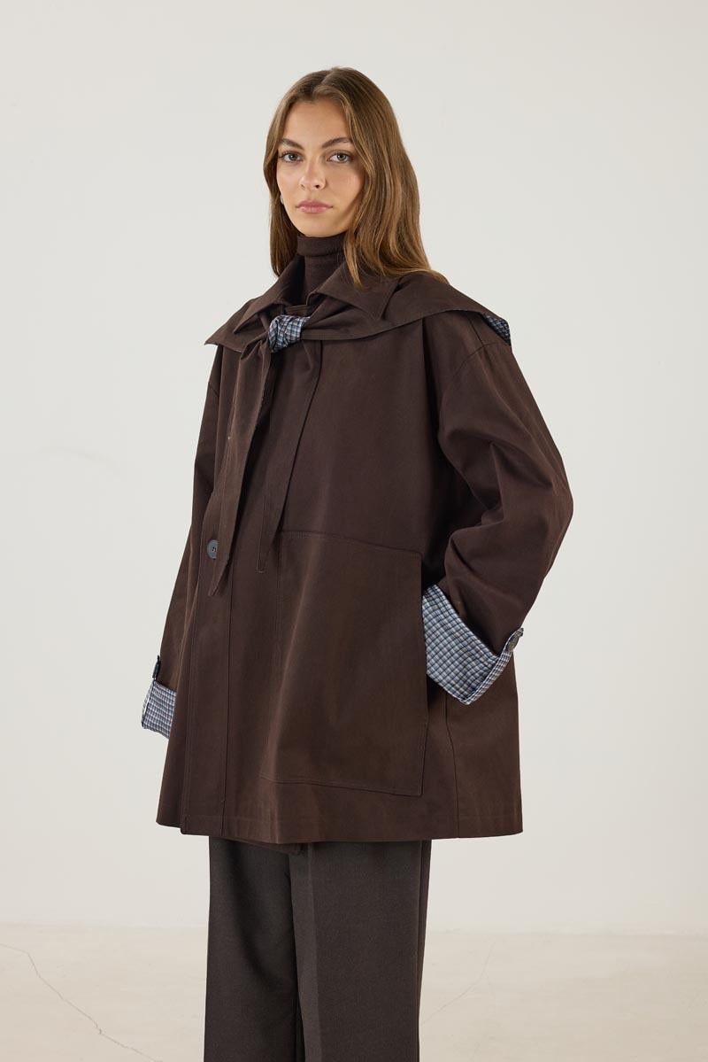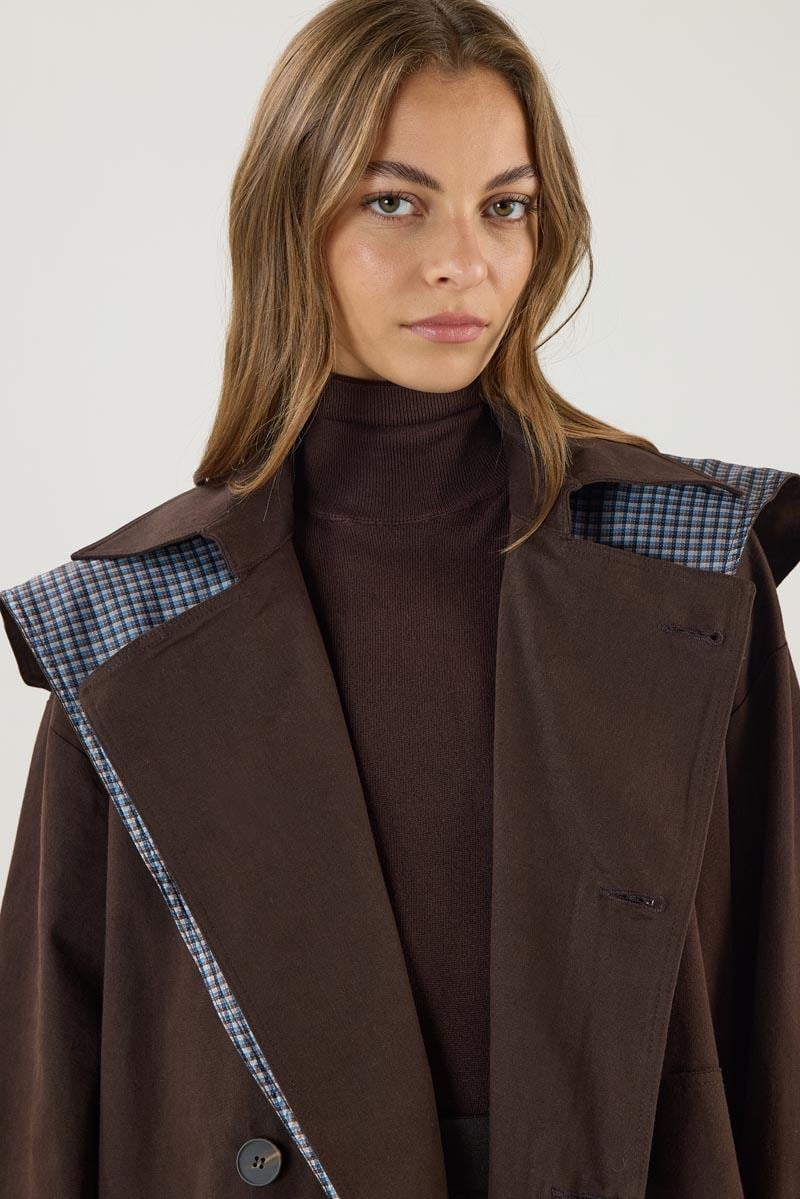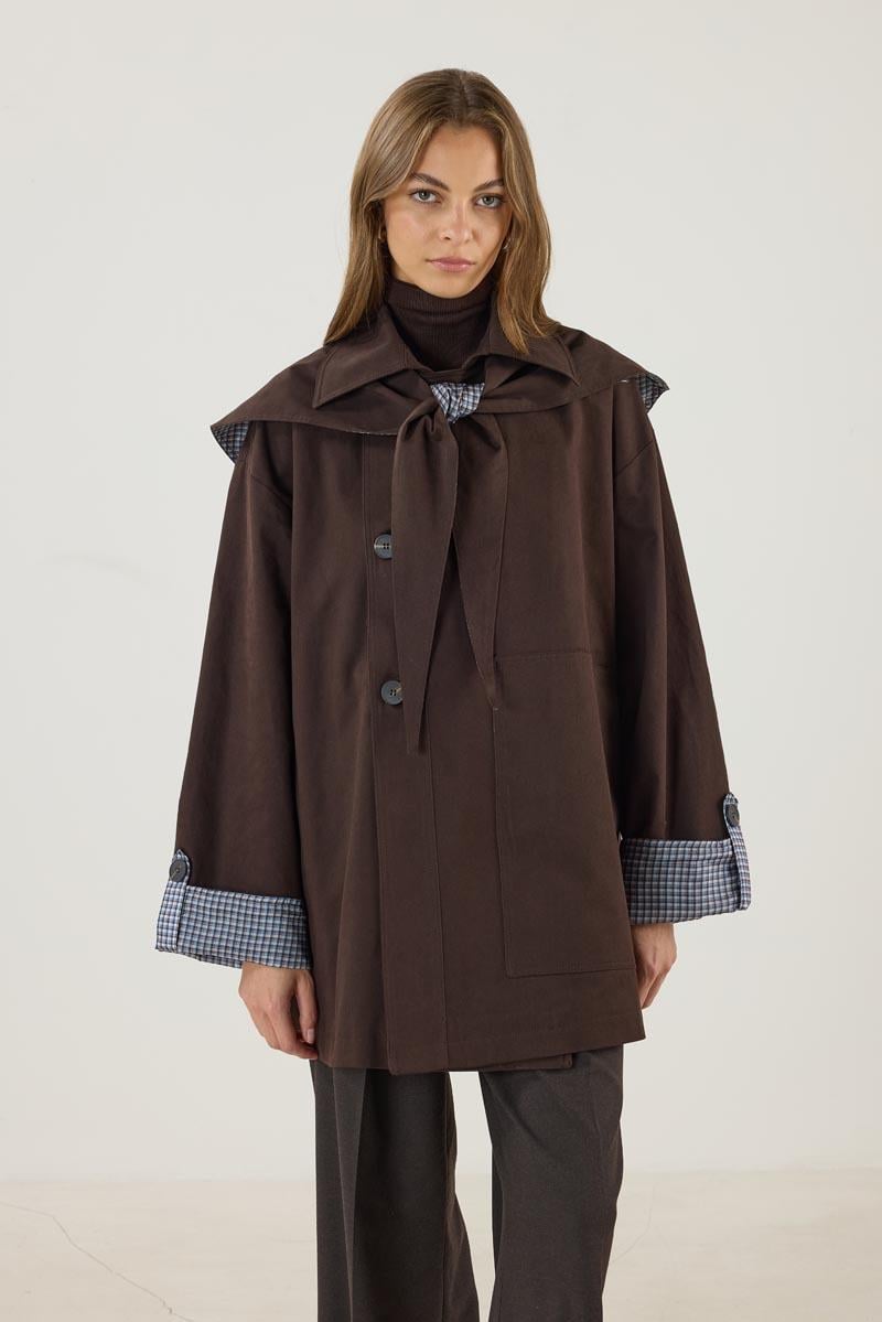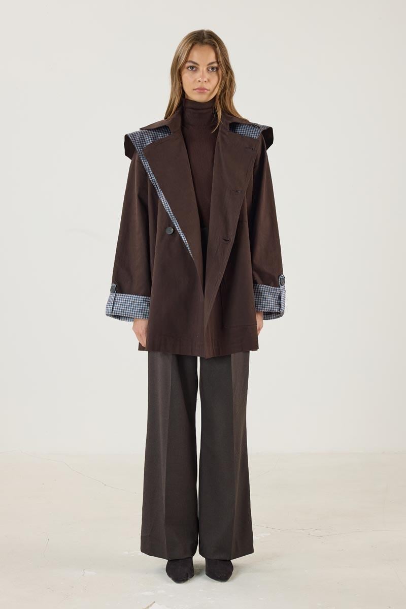 Kadın Gömlek Yaka Ekose Astarlı Trençkot Acı kahve (MTM25KTRC004)