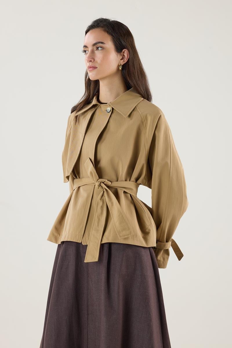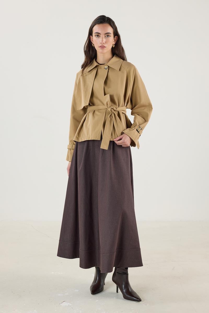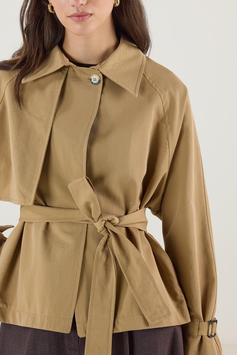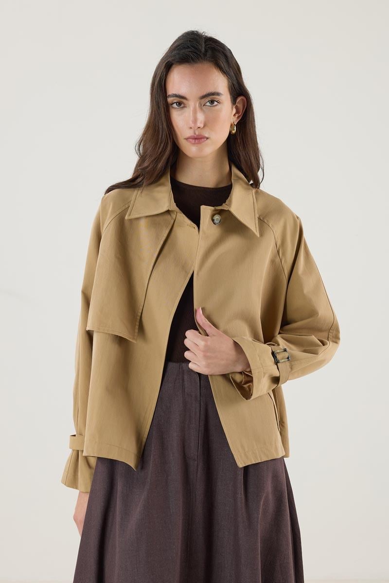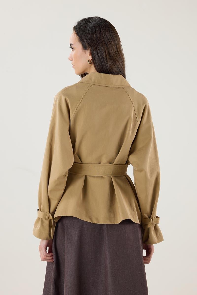 Kadın Gömlek Yaka Kemerli Cepli Kısa Trençkot Camel (MTM25KTRC002)