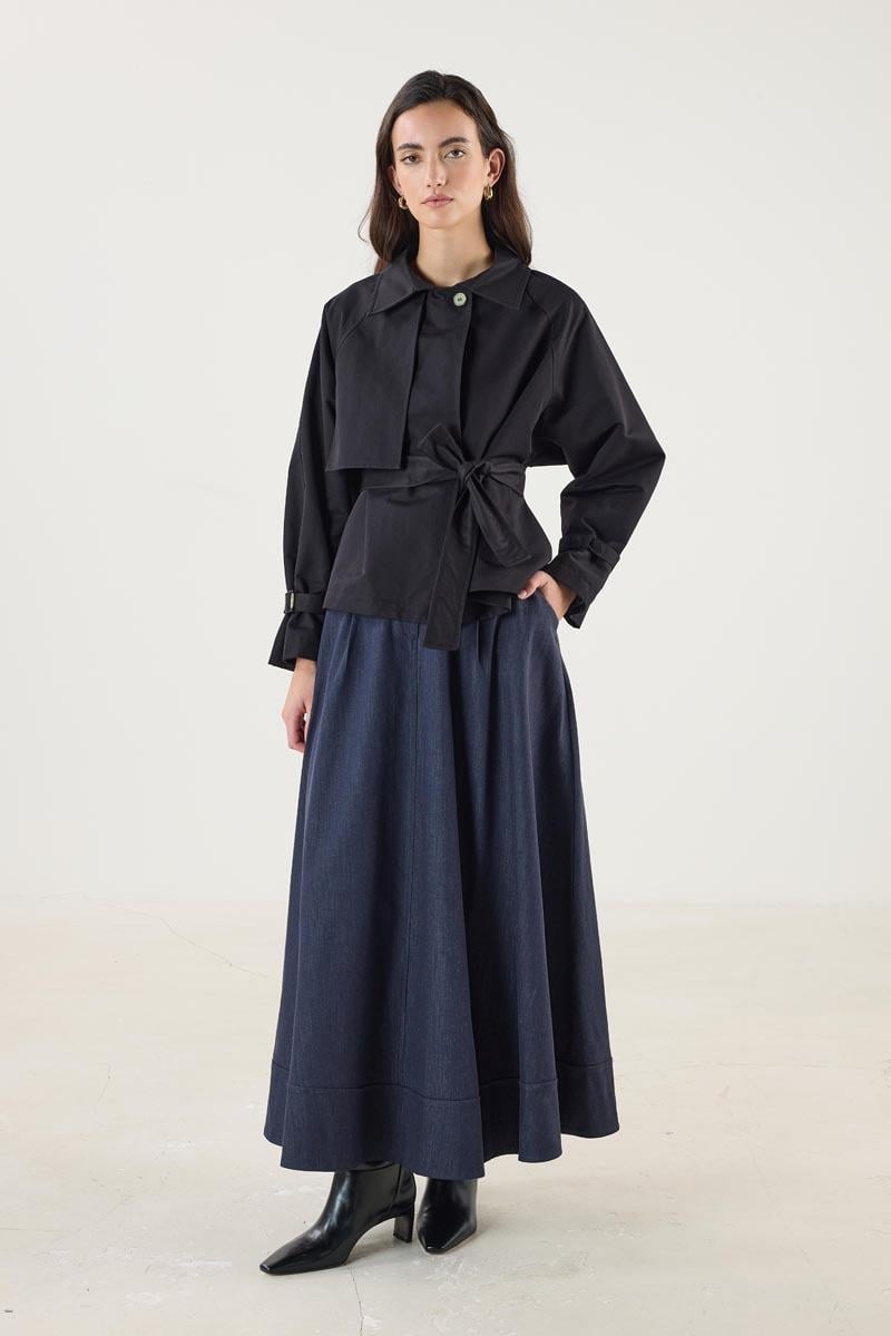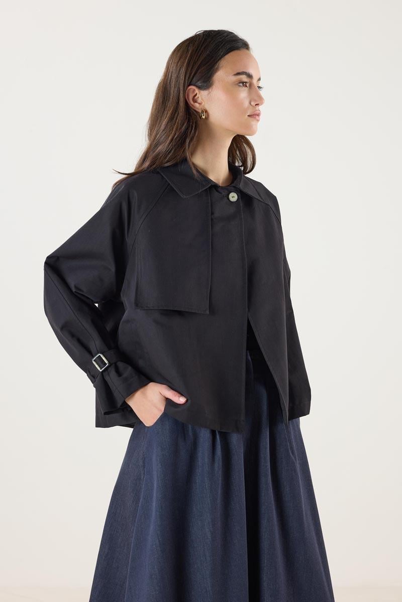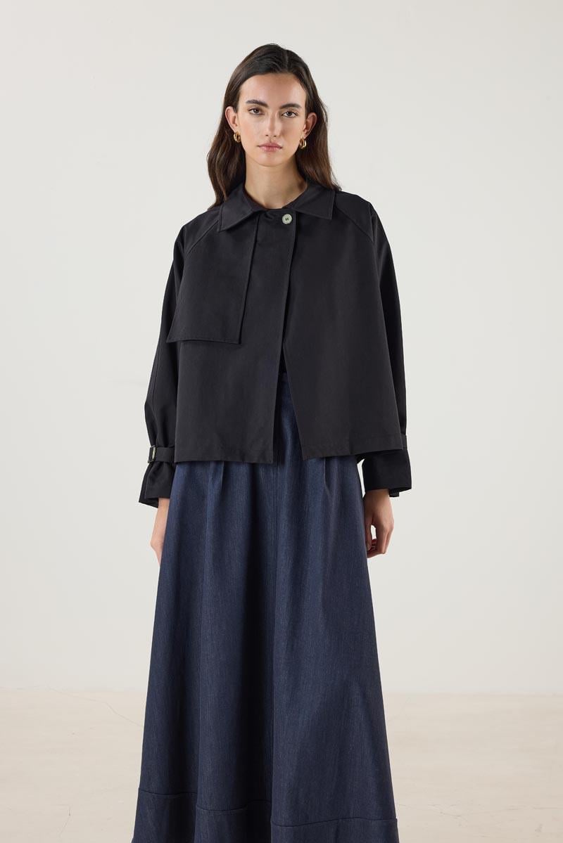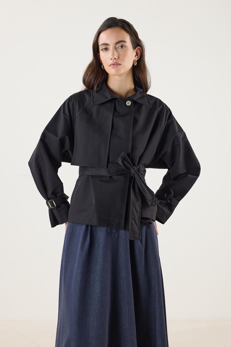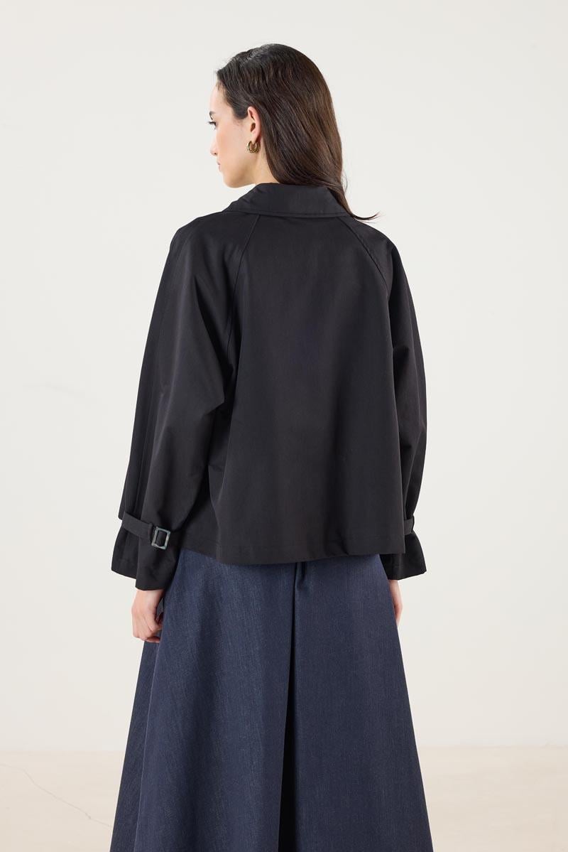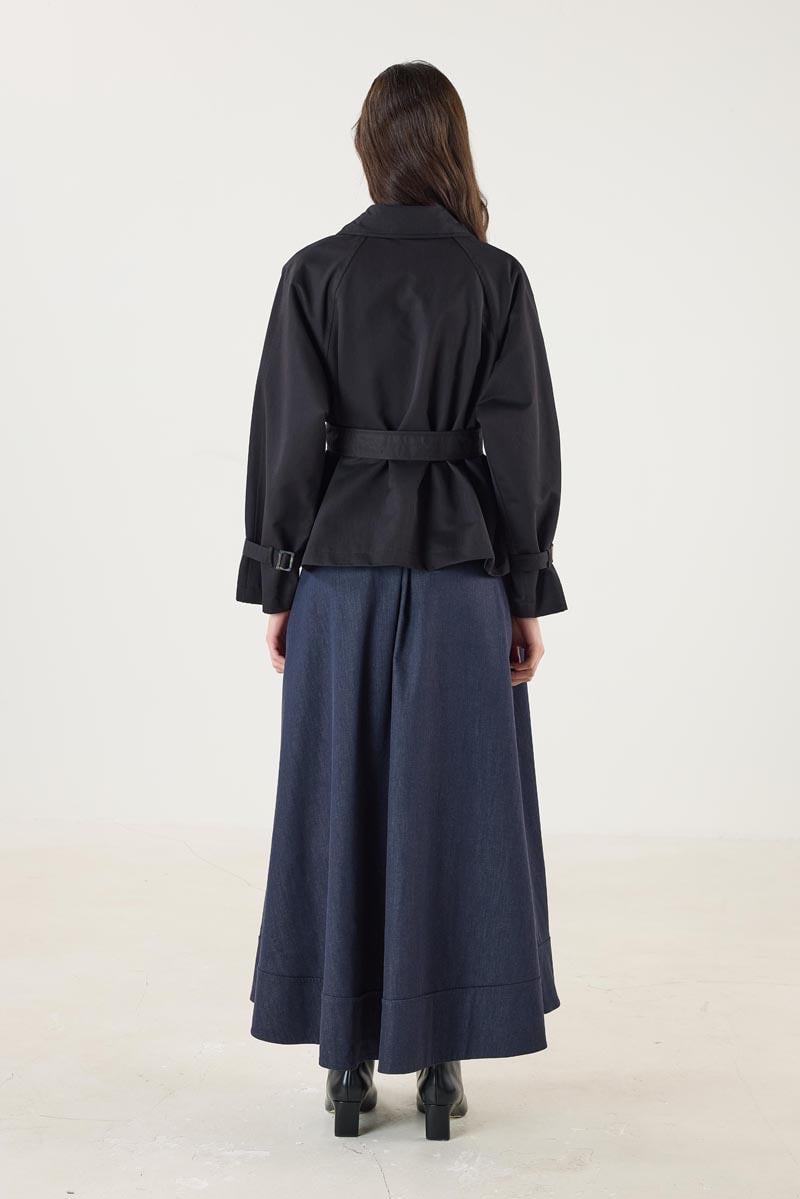 Kadın Gömlek Yaka Kemerli Cepli Kısa Trençkot Siyah (MTM25KTRC002)