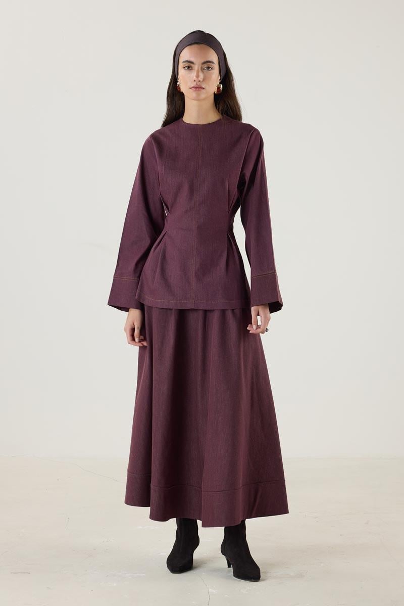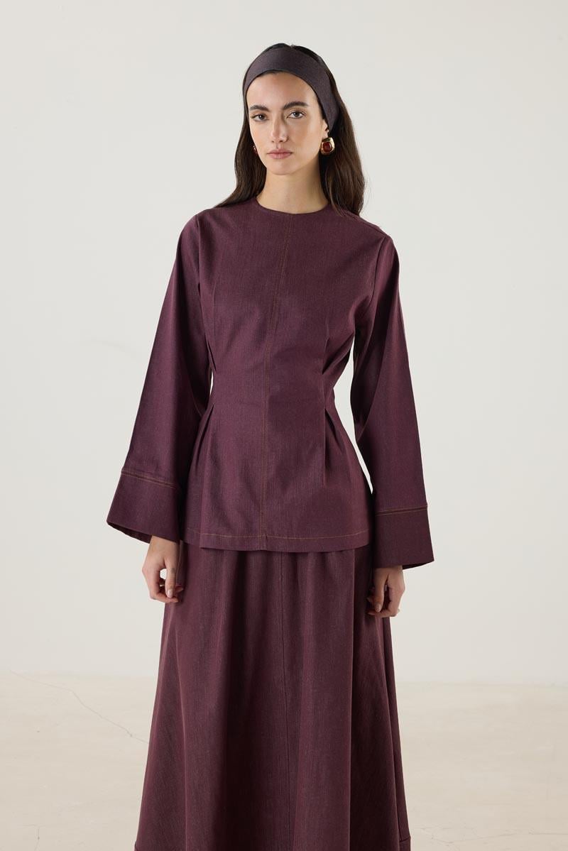 Kadın Bisiklet Yaka Uzun Kollu Pile Detaylı Kot Bluz Bordo (MTM25KBLZ002)