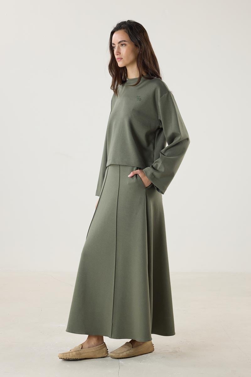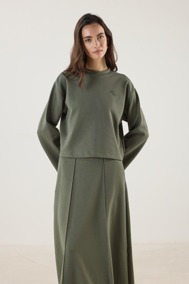 Kadın Yuvarlak Yaka Uzun Kollu Yuvarlak Yaka Nakış Detaylı Kısa Sweatshirt Haki (MTM25KSWT002)